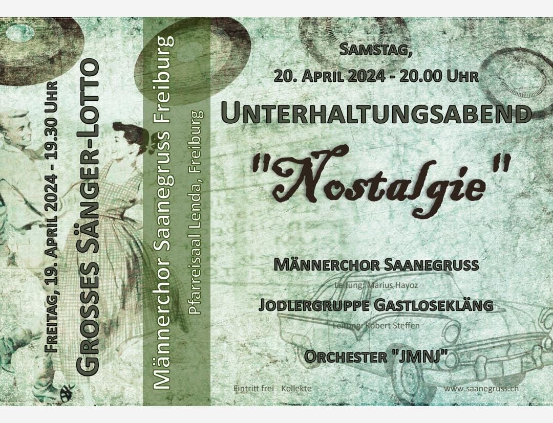 Pfarreisaal Lenda Rue de la Lenda 1, Fribourg, Freiburg, SchweizAm 20. April haben wir die Ehre, erstmals als Gast beim Unterhaltungsabend des Männerchor Saanegruss Freiburg dabei zu sein. Es erfüllt uns mit Freude, als Gastlosekläng erstmals außerhalb des Jauntals unsere Musik präsentieren zu dürfen.